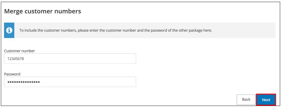 Select the option Merge Customer Numbers to proceed. This opens a new window. Go to the menu item Update Customer Numbers and enter the customer number of the package to which you want to transfer the selected order. You also need a domain name from the package and the matching password.