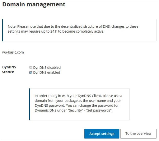 Please note that due to the decentralized structure of DNS, changes to these settings may require up to 24 hours to become completely active.