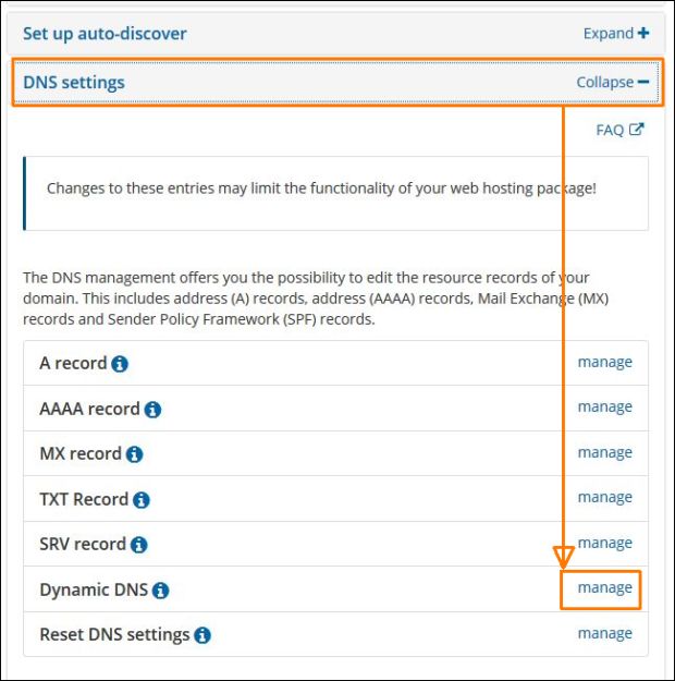 If you enable Dynamic DNS (DynDNS) for a domain or subdomain, the other configuration possibilities in the DNS settings will be inactive. The configuration of these services is no longer possible through STRATO. However, these services can alternatively be configured on the computer that you set up for the DynDNS.