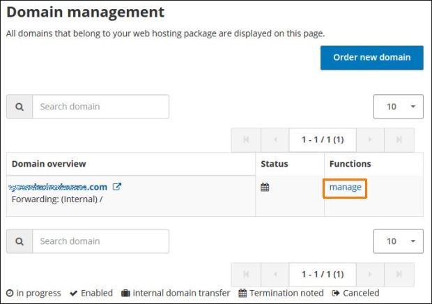 TheDynDNS settings option can be reached in the Customer Login after selecting your package. In the desired package, select the menu option Manage domains in order to go directly to the domain administration: