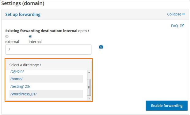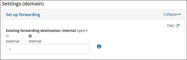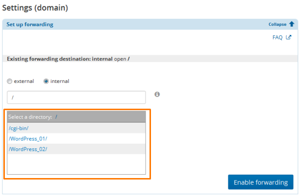 With internal forwarding, you can assign any directory on the web server to a domain or sub-domain. If the domain is accessed, the files that are saved in and below this directory on the web server will be displayed.