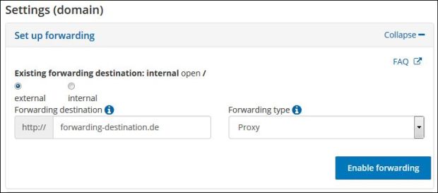 With external forwarding, you can forward your domain to any internet address (beginning with http://) with an online service, different provider or to an address from a different STRATO package.