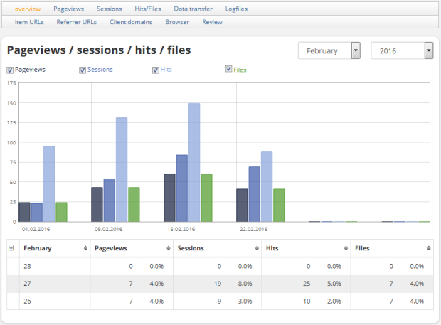 Log files give you the possibility to analyze hits to your website(s) in a detailed manner. The web server data for the last six weeks is provided as a ZIP archive for this purpose. The graphical statistics can be retrieved for several years. Due to data privacy reasons, the host name or the IP address of the client accessing the website will be anonymous in the log files.