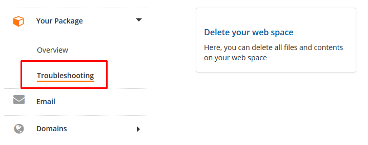 Proceed as follows to clean up your web space: Go to the STRATO Login, click on “Your Package” and select the menu item “Troubleshooting” . Finally click on the tile .“Web space cleanup”..
