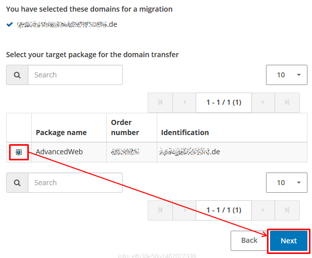 You will now be shown an overview of the selectable target orders under your customer number. Please select the order in which you will like to manage your domain(s) in future. Click on Next again to proceed with the domain transfer.