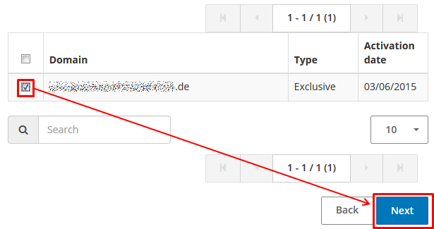 On the following page, please select the domain(s) which you wish to transfer. You can select any number of domains, as long as the domains are still active. For example, domains that have already been transferred or canceled cannot be transferred. Once you have made your selection, please click on Next.