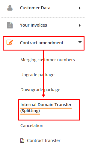 After logging into your Strato Login area, please select the menu item Contractual Modifications/ Internal Domain Transfer (splitting) .