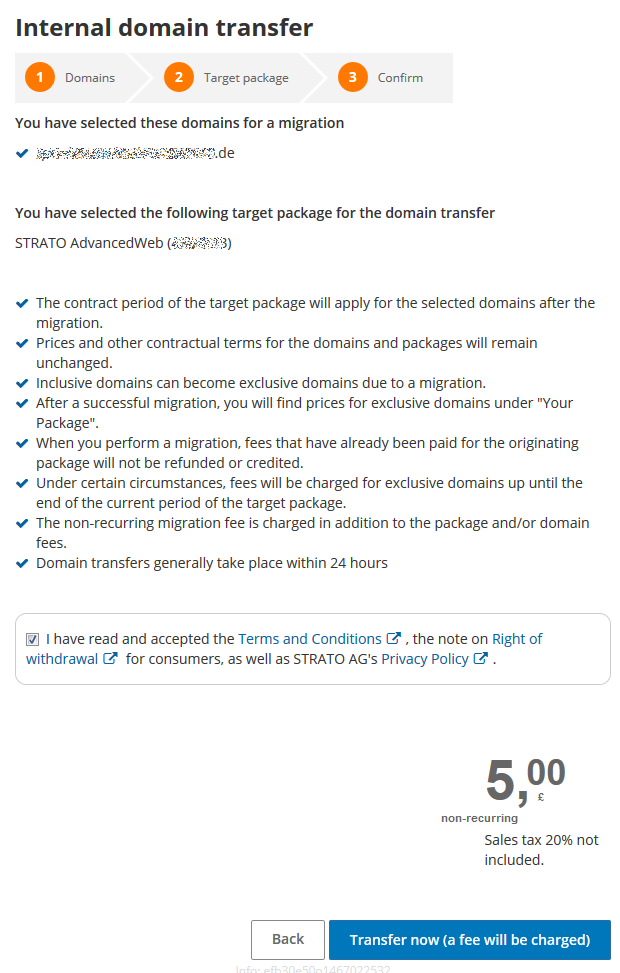 In the last step, you will be shown an overview of the selected domain(s) and the selected target order. Now accept the Terms and Conditions and click on the button Transfer now (a fee will be charged). The transfer will then be performed for you as soon as possible. It will take place within 24 hours, and you will be sent an email as soon as the domain(s) have been activated for you in the target package.