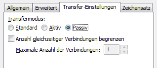 The server data is entered by clicking on the New Server button. We recommend enabling the passive mode. Please click on the Transfer Settings and highlight the passive mode under New Server .