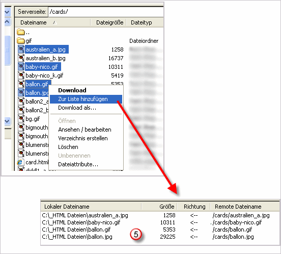 You can transfer an individual file by double-clicking on the file name. This causes the file to be transferred to the list of files to be transferred (figure 1 (5)), and the FTP transfer will start automatically.