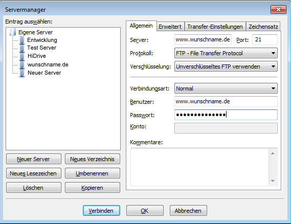 - Server: desiredname.de (instead of "desiredname.de", enter your own domain.)