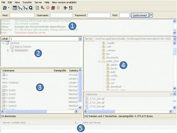 After you have installed and started FileZilla, the program window will open automatically. As with most other FTP programs, this window is divided into several areas.
