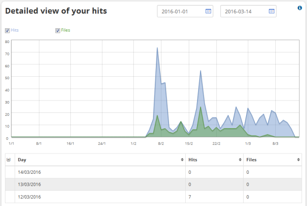 Via the Hits/Files line, you will see an individual analysis of the hits for the entire month listed according to the point in time the element was viewed. An example of how this may appear is as follows: