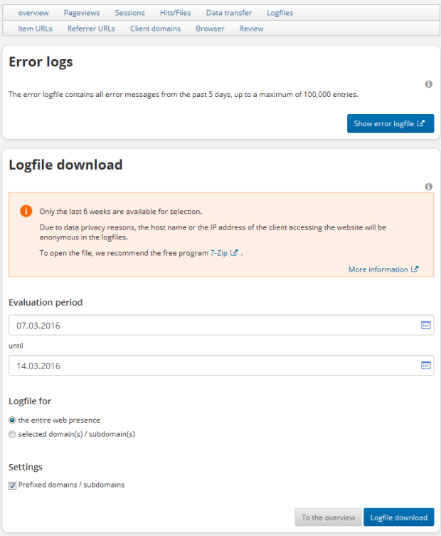 Go on our website to the password protected customer login.A context menu will appear on the left. Please click on the Statistics menu option (the statistics analysis is currently available starting with the PowerWeb Basic and for older packages starting with the BasicWeb XL). You will receive an overview of the most important statistical analysis parameters in a graphical representation.The different statistical figures for your internet presence according to freely selectable periods of time are listed in the table. By clicking on the respective options, you can view more detailed information:
