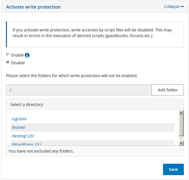 Also, for write protection, it applies that after activation, all directories are write protected in the basic setting. If you would like to offer write access for individual directories, you can place these on the "Exclusion List".