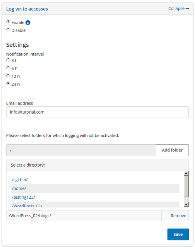 All directories are monitored in the standard setting. However, you can also exclude individual directories from the logging . if desired. To do this, please select the corresponding directory for which the exception should apply from the list and click on Add directory .