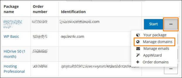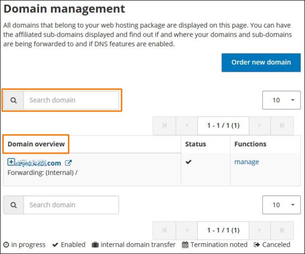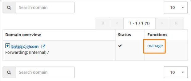 The domain search field is particularly useful if you would like to manage several domains in your package. You do not have to enter the entire domain name, but rather just one letter. In the results, alldomains and sub-domains are displayed in which the value you entered is included.