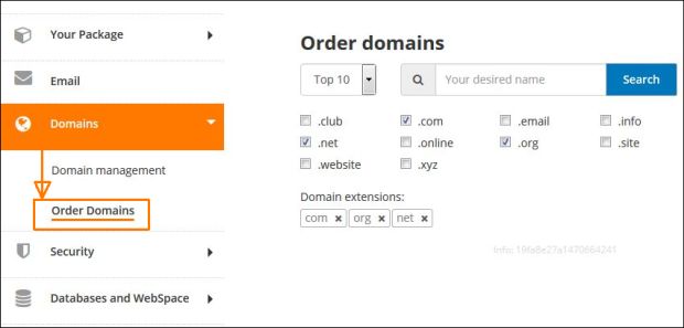 Under the main point Your Package and by clicking on Order domains you can easily order further domains in your package, provided that you have logged in with your customer number to the password protected Customer Service Area.