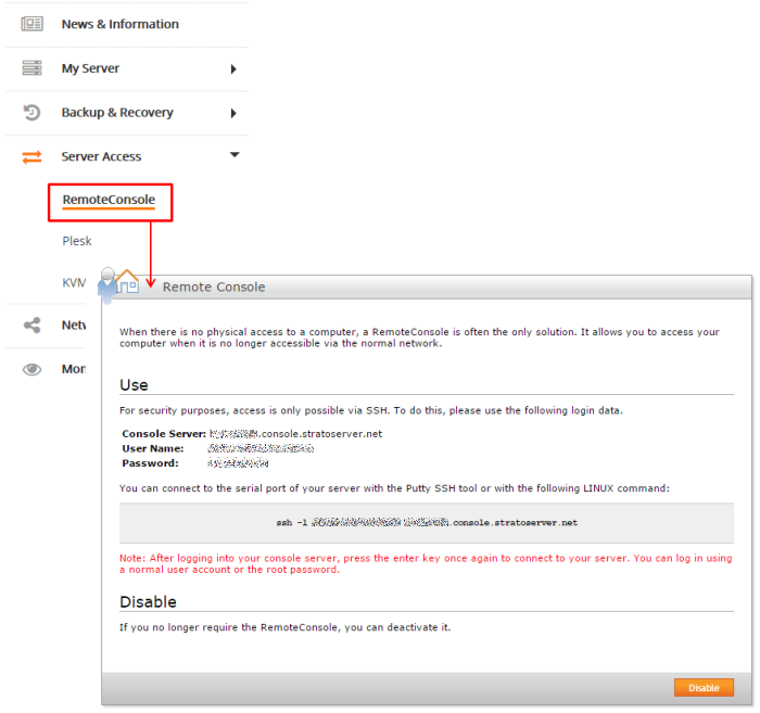 NoteIf the SSH connection to the RemoteConsole disconnects and cannot be established again, it may help to disable the RemoteConsole through the Customer Service Area. Please reactivate the RemoteConsole after a short while.