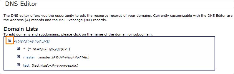 To configure a subdomain, first go the domain list and select the domain name for which you would like to create a subdomain. Click on the plus symbol in front of the domain to make additions to the list.