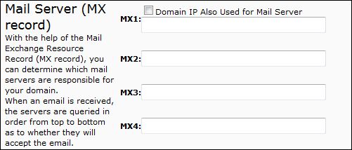 In addition to the A record, you can also change the MX record for the selected domain on this page. When activating the option: The IP address defined for the domain is also added as the first MX record if the domain IP is also used for the email server. You can enter additional MX records in the following lines.