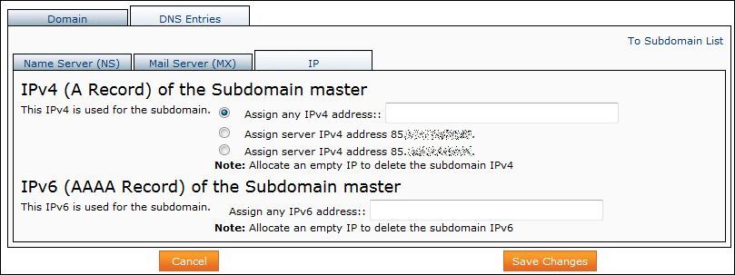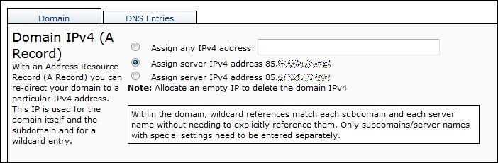 The following pages let you change the A record for this domain. To do this, you can either use an external IP address or select one of your server’s IP addresses directly.
