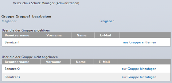 By clicking on Remove protection you can remove the directory protection previously set. If you click on Info, the access rights from the groups and users will be displayed.